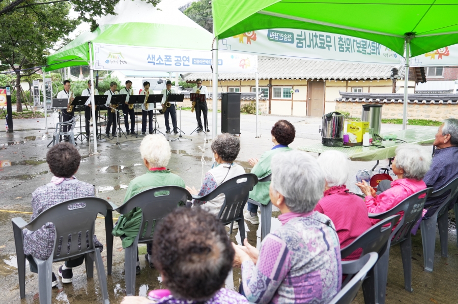 ‘행복마을 만들기’ 사업은 자원봉사자들의 재능기부를 통해 나눔문화를 확산하고, 주민 주도의 참여로 활력 넘치는 마을을 조성해 지역공동체 의식을 회복하기 위한 프로그램이다. 특히 이번 활동은 최근 산불 피해를 입은 주민들의 마음을 위로하고 마을공동체의 유대감을 강화하는 데 중점을 뒀다. 이에 앞서 지난 14일에는 산불피해 주민을 대상으로 한 심리회복지원 프로그램을 진행했으며, 이번 행사에는 대한적십자봉사회 청송군지구협의회, 청송읍건강마을지킴이, 청송라온색소폰앙상블, 파천면지역사회보장협의체, 청송시니어자원봉사단, 행복나눔집수리봉사단, 꽃그리다, 청송안경원 등 8개 단체 50여 명의 봉사자들이 참여했다.