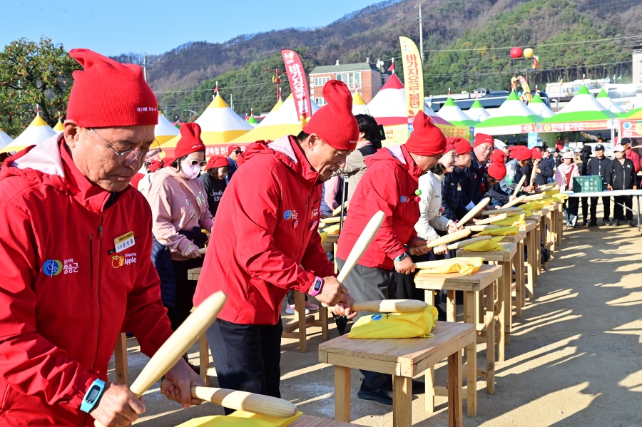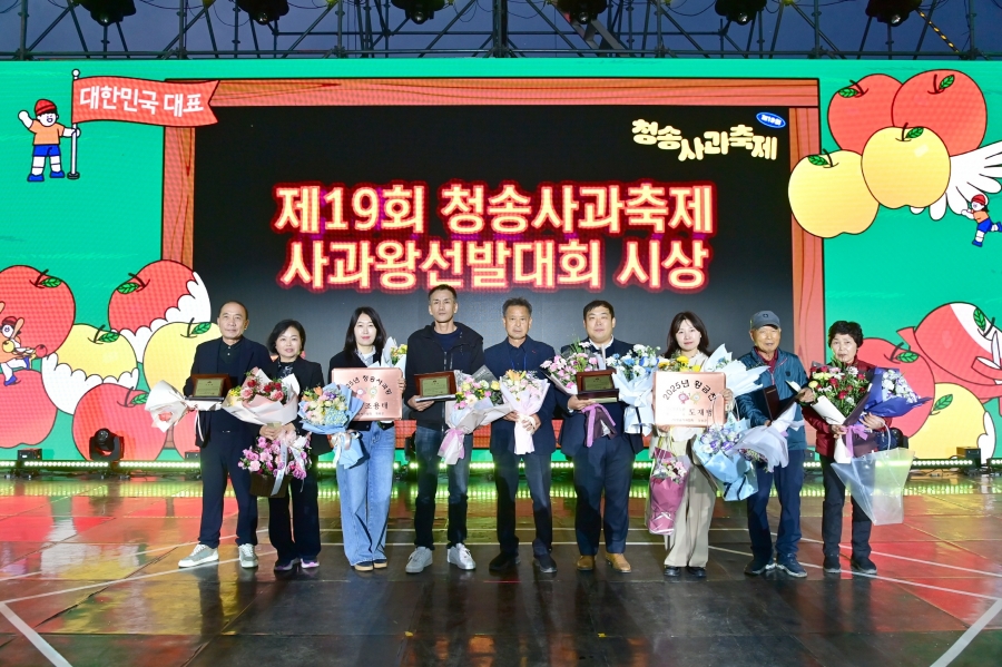 대표 프로그램인 ‘청송사과 꽃줄엮기 전국대회’에는 전국 17개 팀이 참가해 이색 볼거리를 제공했으며, 청송사과 퍼레이드·줄다리기·풍물한마당 등에서는 8개 읍·면 주민이 직접 참여해 관광객과 함께 어우러지는 참여형 축제의 진면목을 보여줬다. 또한 축제 기간 중 열린 사과왕 시상식과 군민상 시상식이 축제의 의미를 한층 더했다. 사과왕 시상식에서는 ▲사과왕 조용태(안덕면) ▲우수상 김창율(부남면) ▲장려상 정무상(현서면) ▲황금진 도재범(안덕면) 씨가 수상의 영예를 안았으며, 군민상 시상식에서는 ▲임윤기(주산지리 이장) ▲권오영(신기2리 이장) ▲남법식(현동면체육회 부회장) ▲김영조(부남면 지역사회보장협의체 민간위원장) ▲권영선(바르게살기운동청송군협의회 회장) ▲권태욱(명성 TNS 전 대표) 씨가 수상했다. ![제19회 청송사과축제-[사과왕].jpg](/files/upload/2025-11-04/202511040125141788557907.jpg)